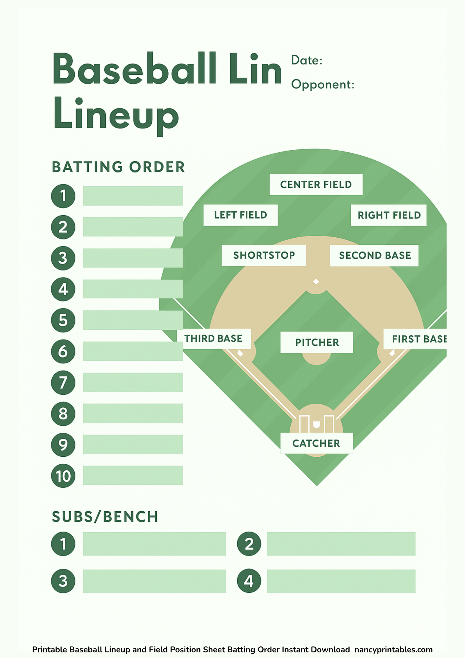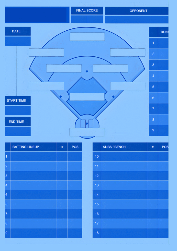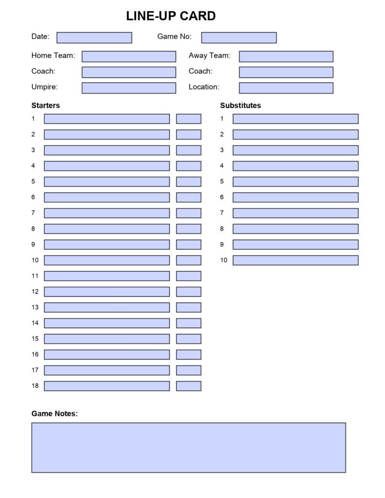Downloadables Baseball or Softball Lineup and Position Template Printable PNG PDF CANVA EDIT Get Printed (Shop) Baseball or Softball Lineup and Position Template Printable PNG PDF Canva Edit Get Printed (Shop) Fillable PDF Baseball or Softball Lineup Card jpg PDF Get Printed (Shop) Printable Baseball Lineup and Field Position Sheet Batting Order Instant Download PNG PDF Canva Edit Get Printed (Shop) Printable Baseball Lineup and Field Position Sheet Batting Order Instant Download for Coach and Team Mom Team Dad for Game Day PNG PDF Canva Edit Get Printed (Shop) Editable Baseball Batting Lineup Softball Field Position, Printable Lineup Card, Batting Order Sheet PNG PDF Canva Edit Get Printed (Shop) Printable Baseball Batting Order and Lineup Sheet for Baseball Coach or Dugout, LineUp Card By Inning, Game Day Planner for t-ball Coach PNG PDF Canva Edit Get Printed (Shop) LINE-UP CARDDate: ___________________Game No: ___________________Home Team: ________________________________Away Team: ________________________________Coach: _____________________________________Coach: _____________________________________Umpire: ____________________________________Location: __________________________________StartersNo.StartersPos1 2 3 4 5 6 7 8 9 10 11 12 13 14 15 16 17 18 SubstitutesNo.Substitutes1 2 3 4 5 6 7 8 9 10 Game Notes