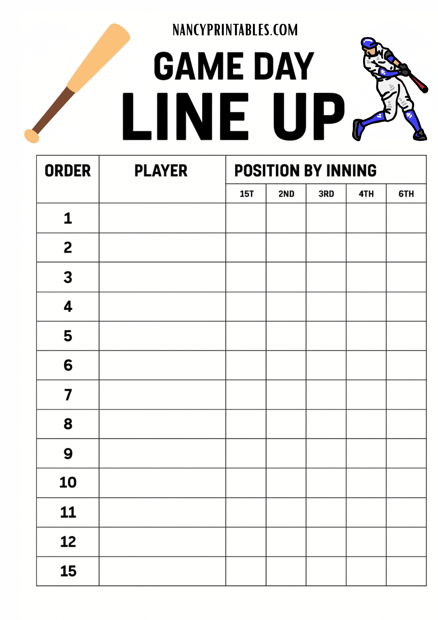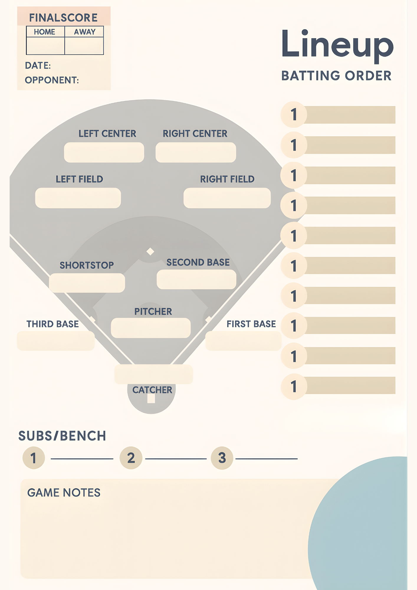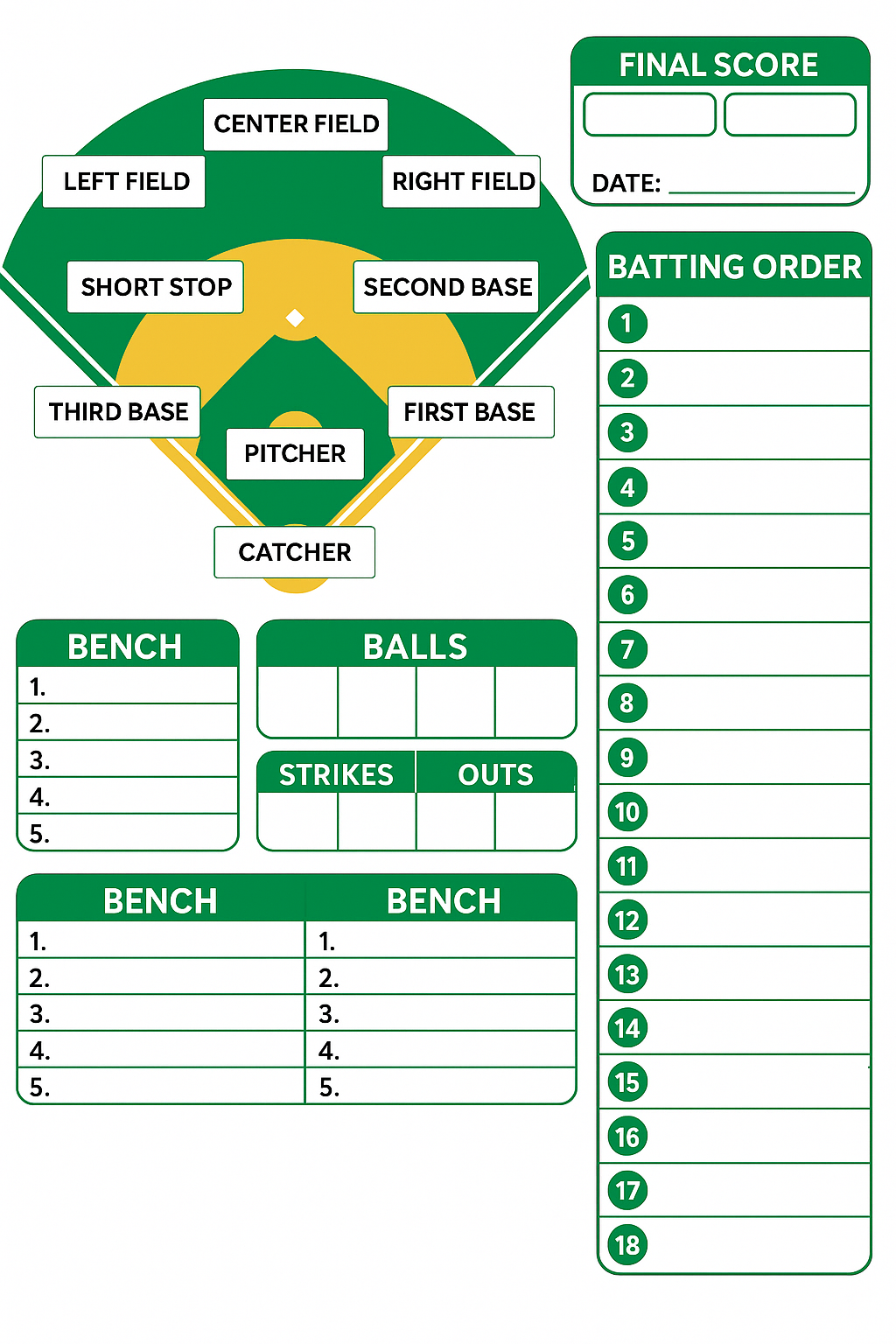 Downloadables Baseball or Softball Lineup and Position Template Printable PNG PDF CANVA EDIT Get Printed (Shop) Baseball or Softball Lineup and Position Template Printable PNG PDF Canva Edit Get Printed (Shop) Fillable PDF Baseball or Softball Lineup Card jpg PDF Get Printed (Shop) Printable Baseball Lineup and Field Position Sheet Batting Order Instant Download PNG PDF Canva Edit Get Printed (Shop) Printable Baseball Lineup and Field Position Sheet Batting Order Instant Download for Coach and Team Mom Team Dad for Game Day PNG PDF Canva Edit Get Printed (Shop) Editable Baseball Batting Lineup Softball Field Position, Printable Lineup Card, Batting Order Sheet PNG PDF Canva Edit Get Printed (Shop) Printable Baseball Batting Order and Lineup Sheet for Baseball Coach or Dugout, LineUp Card By Inning, Game Day Planner for t-ball Coach PNG PDF Canva Edit Get Printed (Shop) LINE-UP CARDDate: ___________________Game No: ___________________Home Team: ________________________________Away Team: ________________________________Coach: _____________________________________Coach: _____________________________________Umpire: ____________________________________Location: __________________________________StartersNo.StartersPos1 2 3 4 5 6 7 8 9 10 11 12 13 14 15 16 17 18 SubstitutesNo.Substitutes1 2 3 4 5 6 7 8 9 10 Game Notes