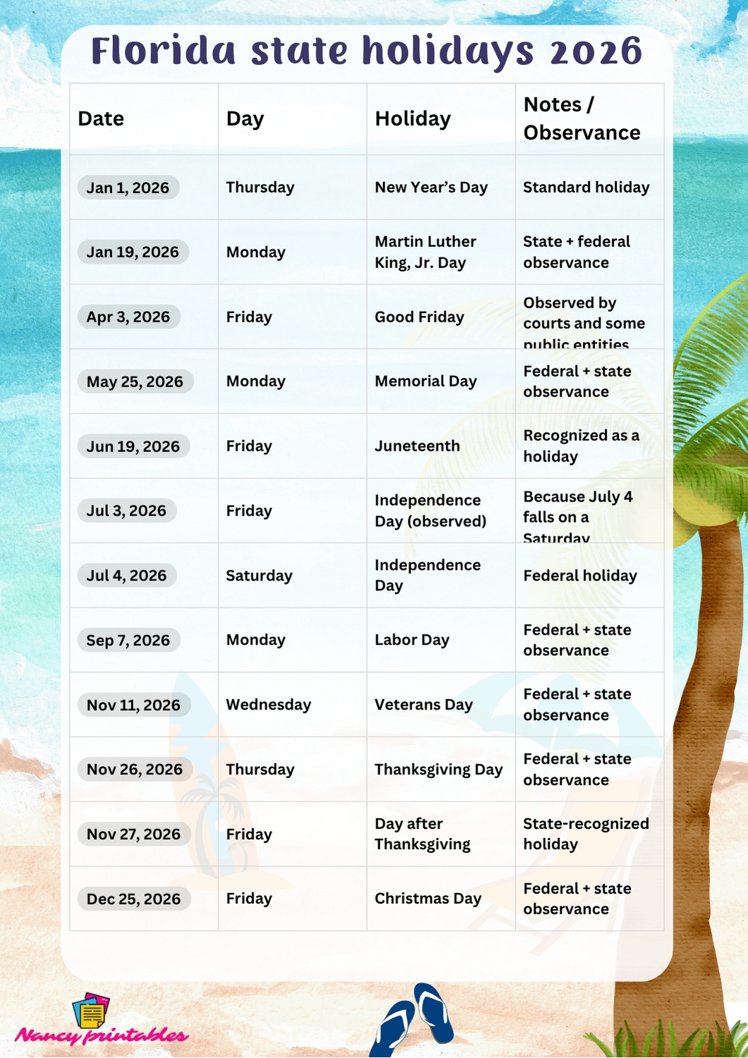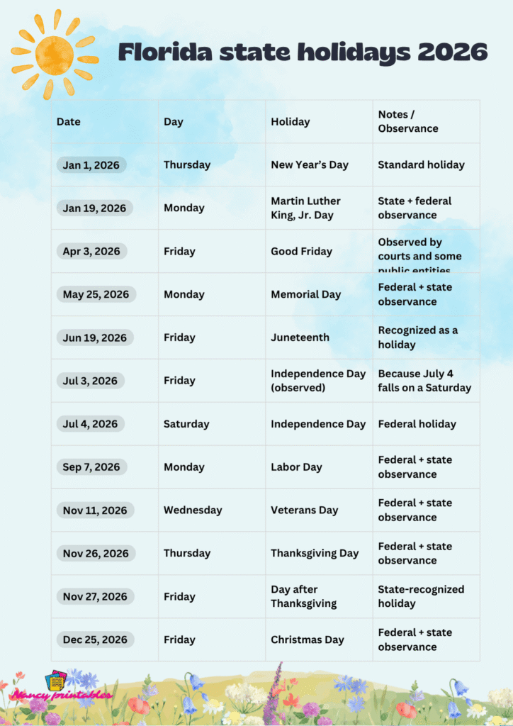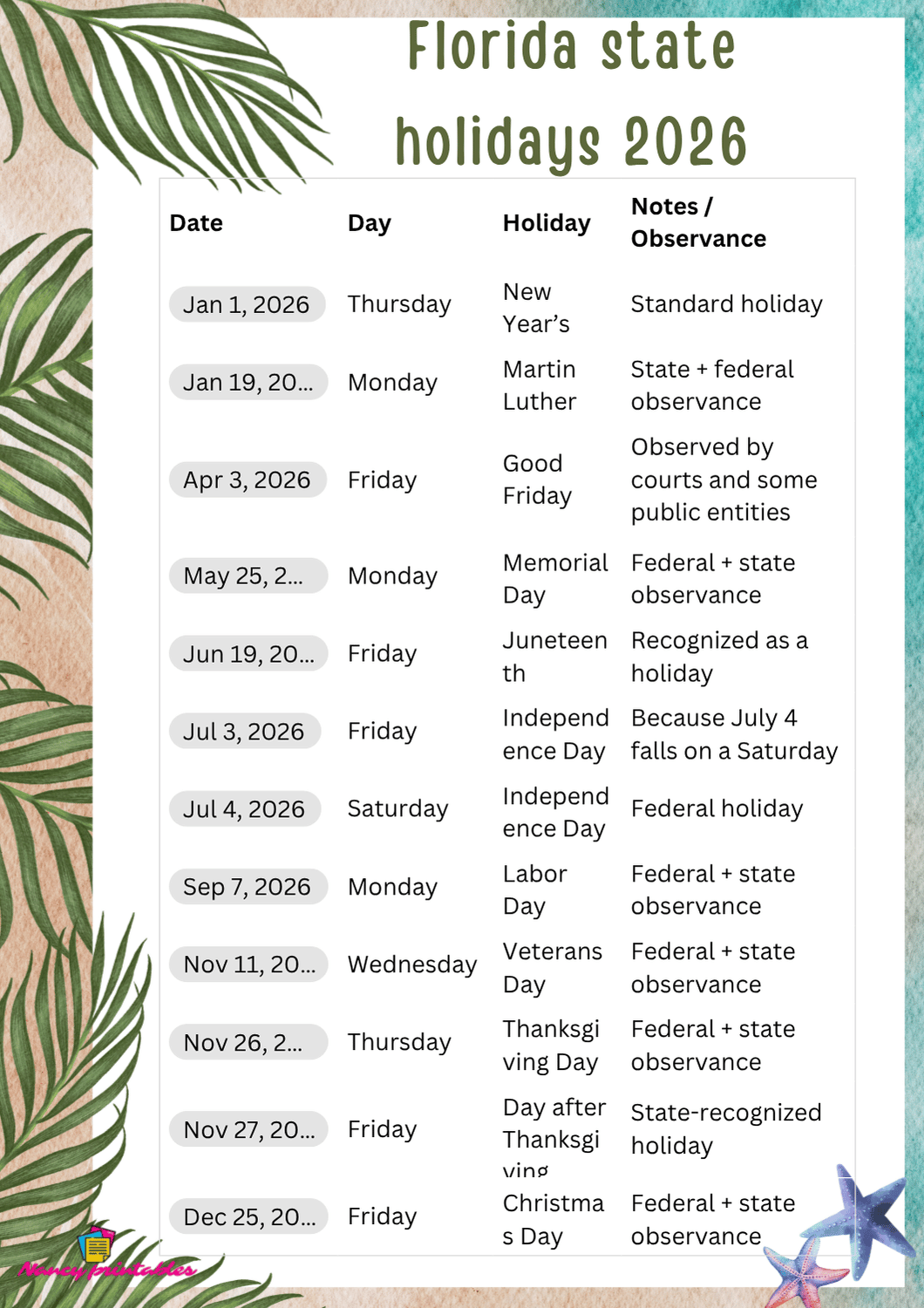 The document lists the official holidays recognized by the State of Florida for 2026, including both federal holidays and state-recognized observances.