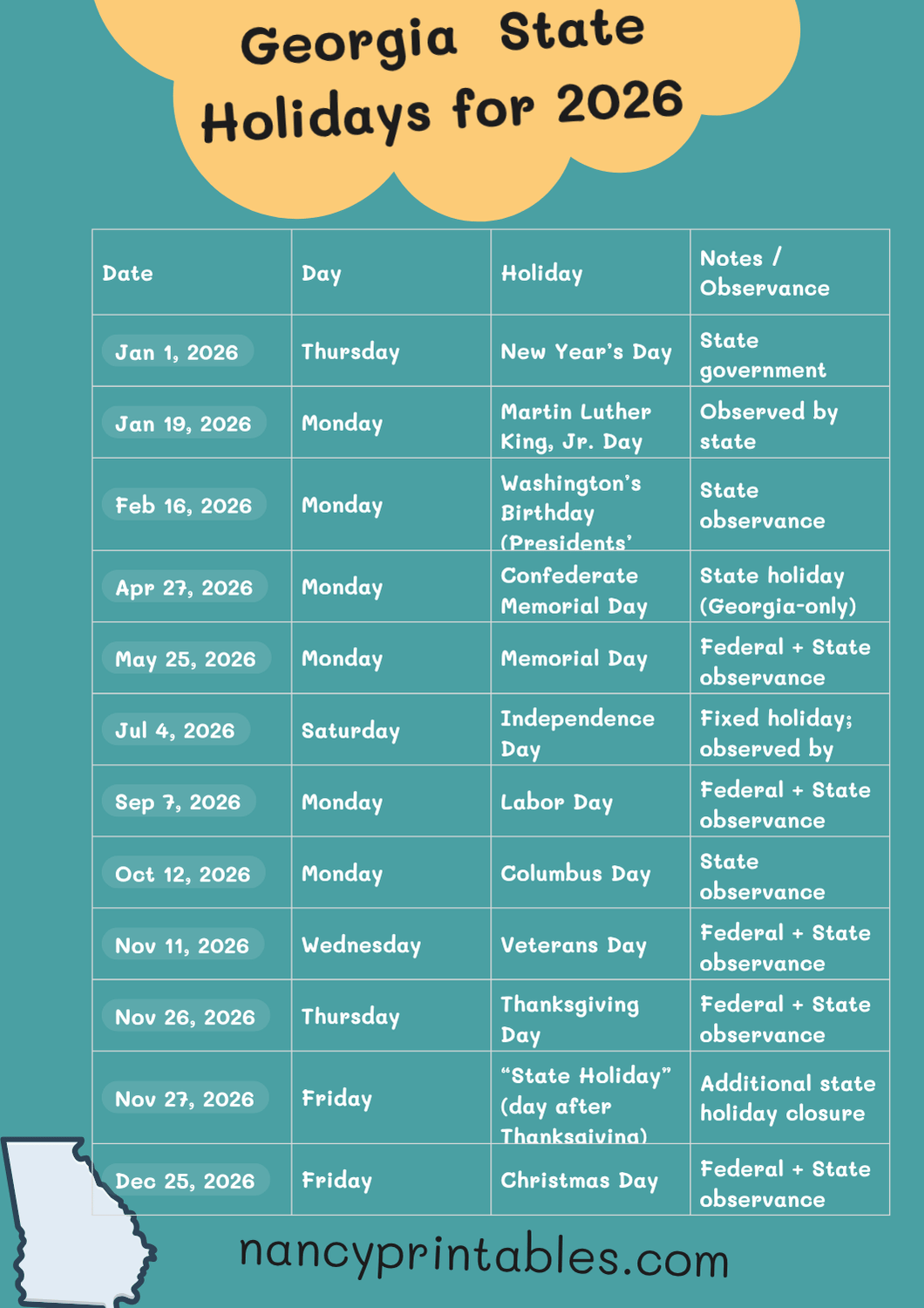 Georgia State GA Holidays for 2026 – Downloadable PDF