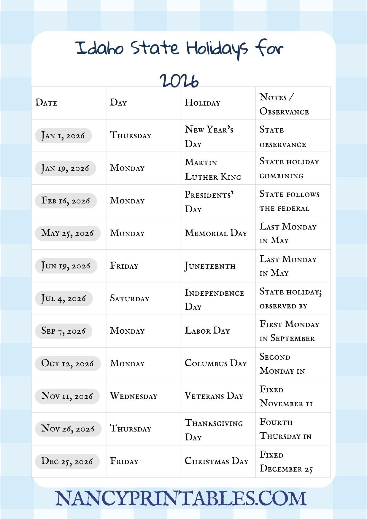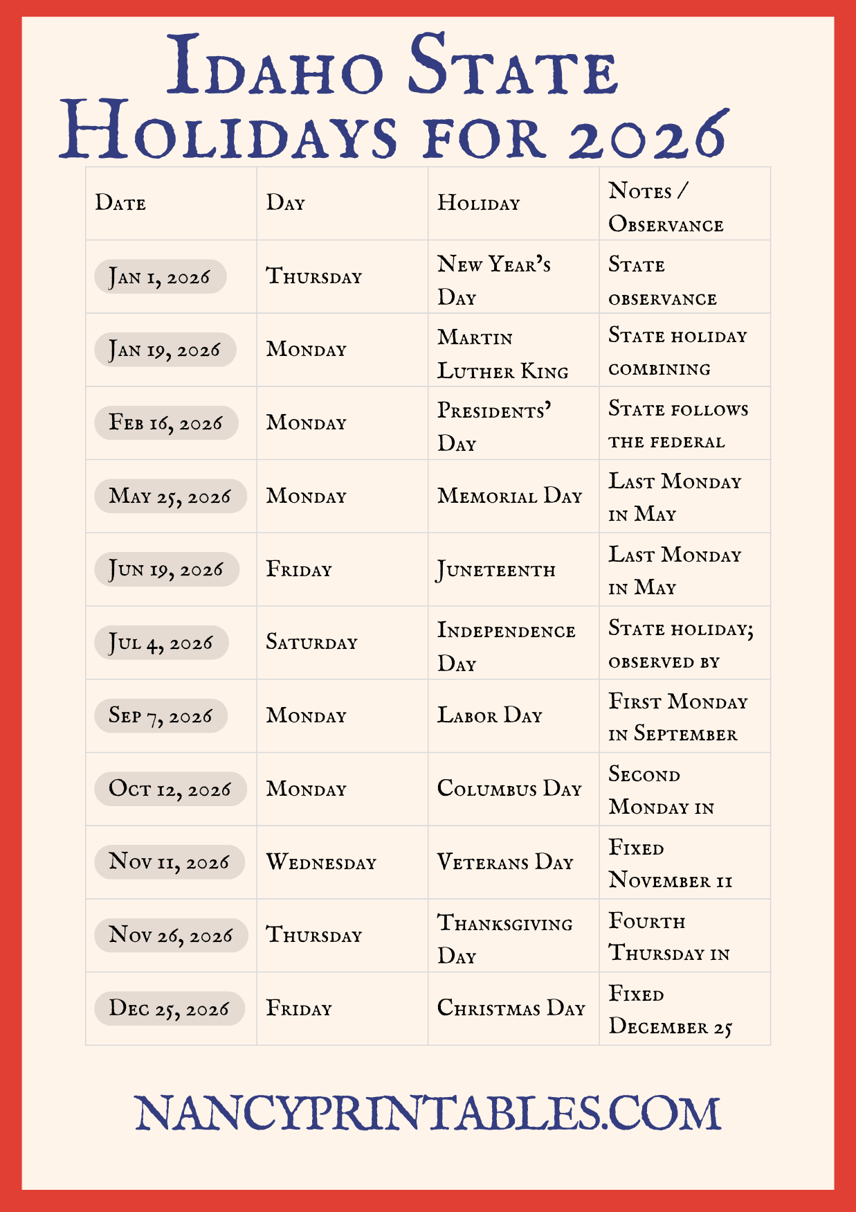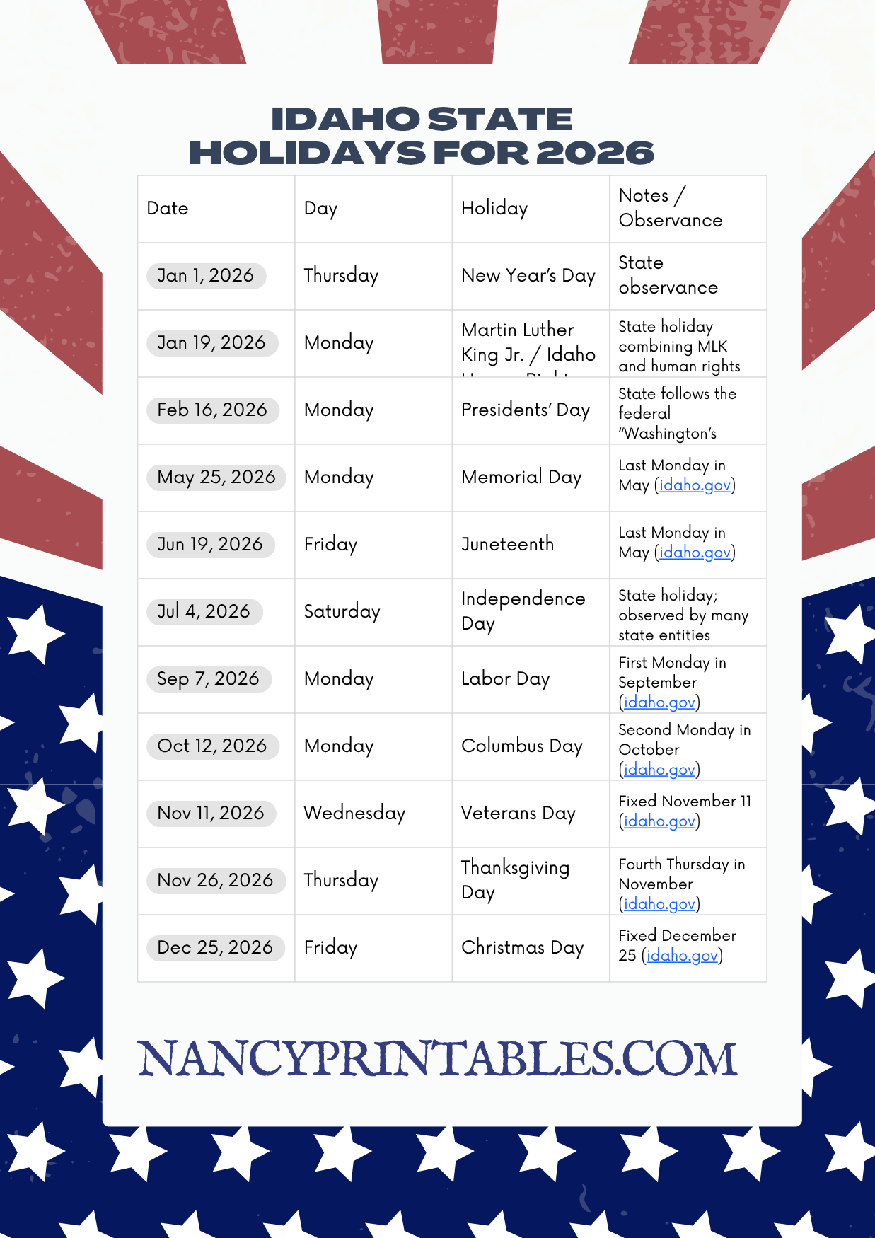 Idaho ID State Holidays for 2026 – Printable Calendar