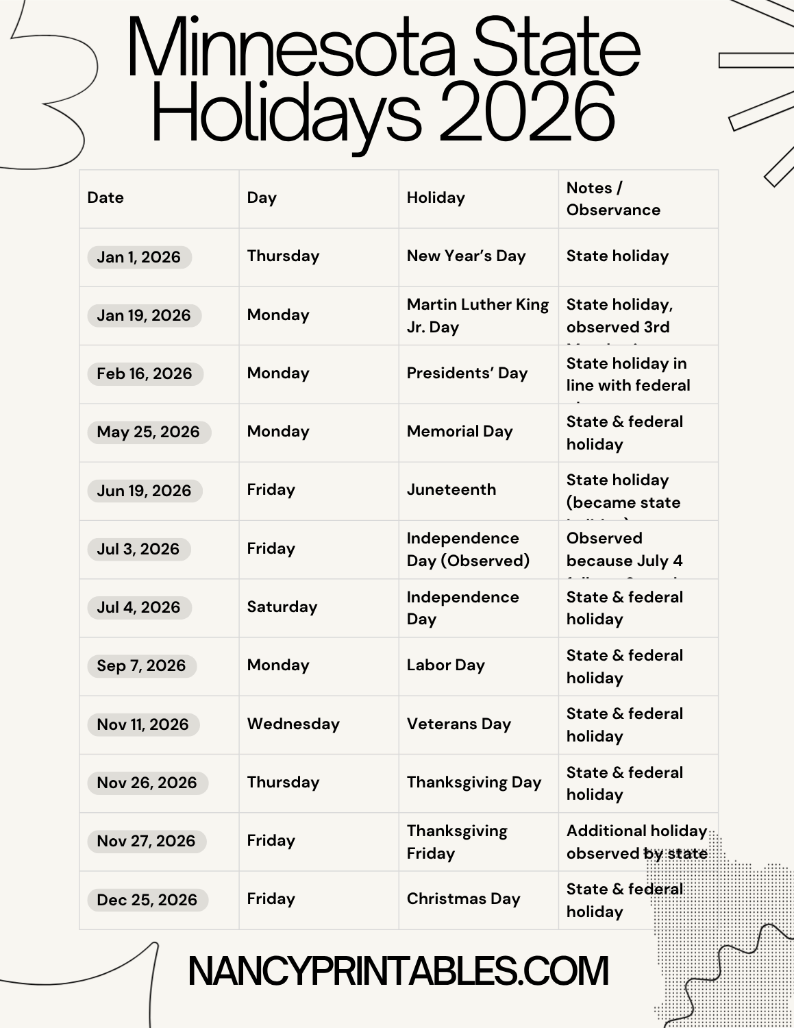 Minnesota MN State Holidays for 2026 Printable Calendar