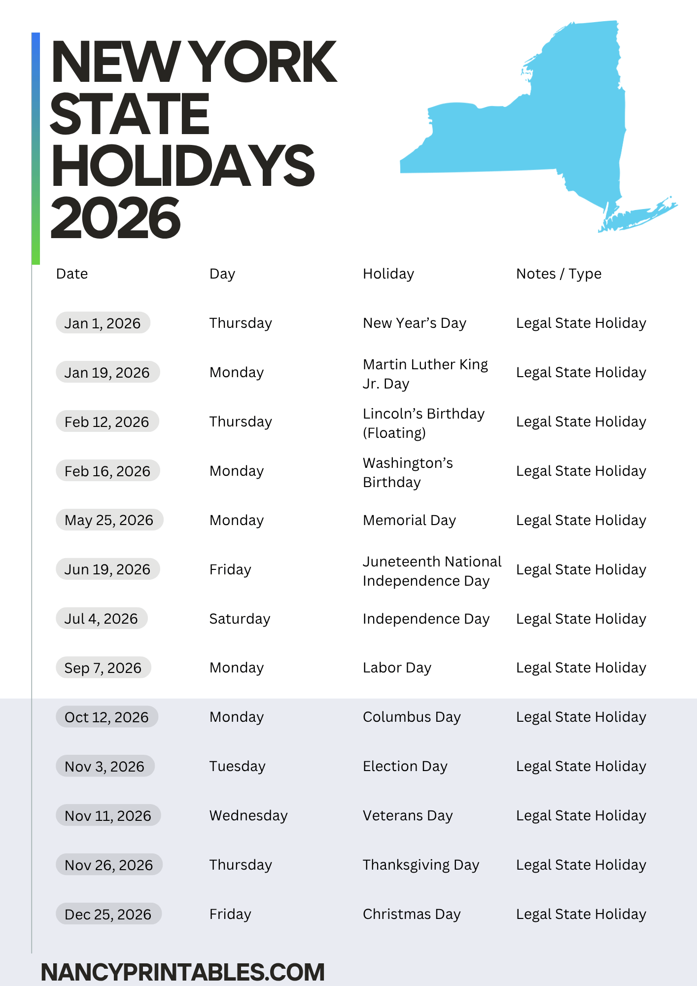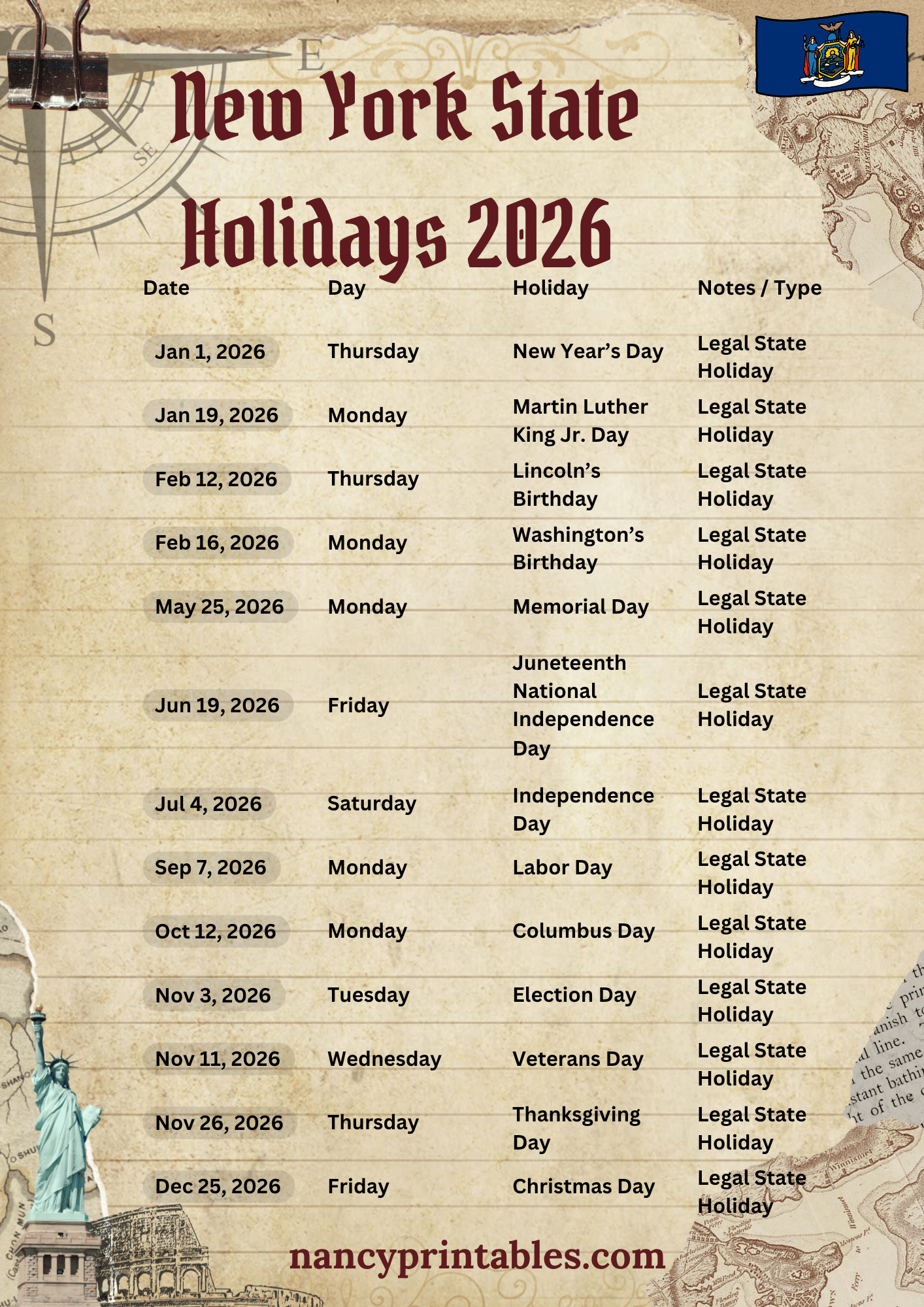 New York State Holidays — 2026