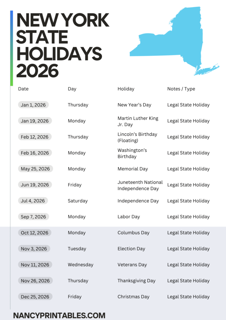 New York State observes both federal and state-designated holidays in 2026, including Lincoln’s Birthday and Election Day which are unique to the state. These holidays apply to all state offices, courts, and public institutions throughout New York.