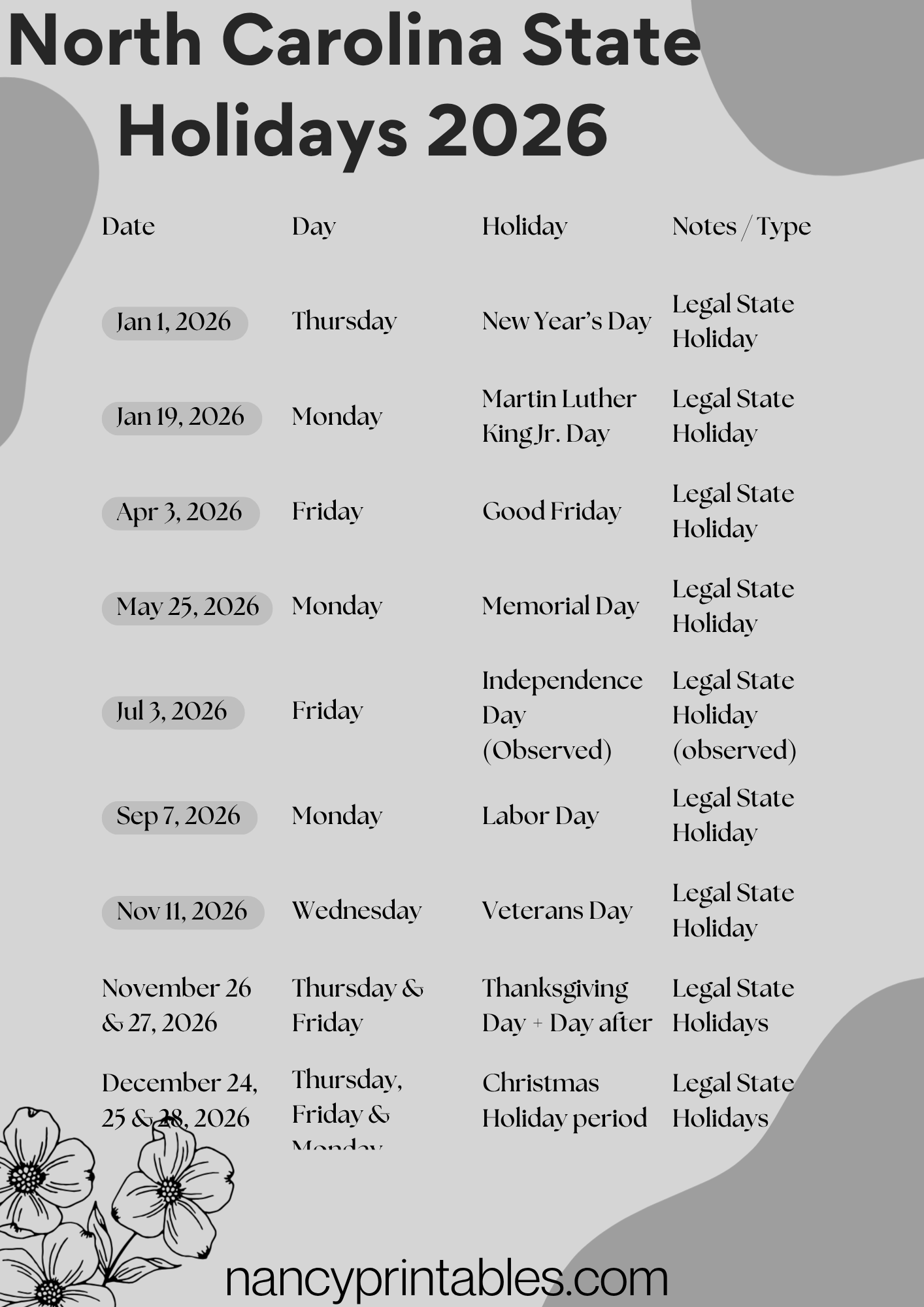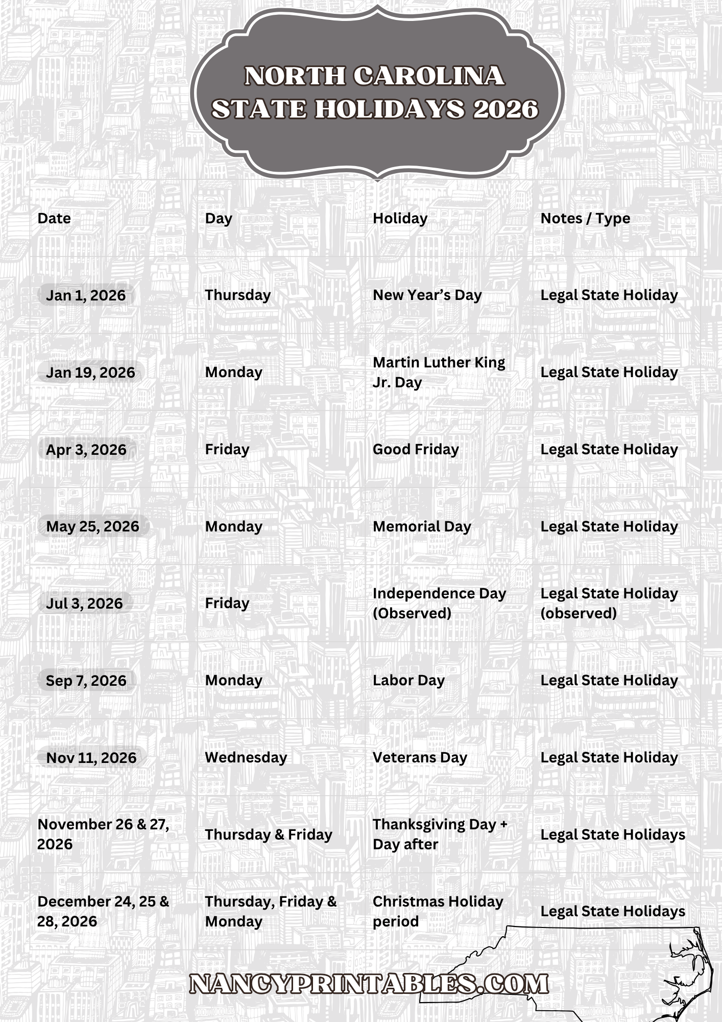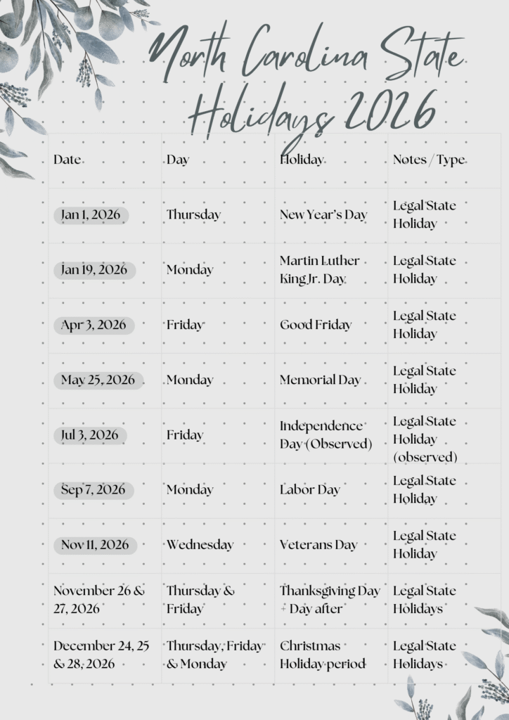 The North Carolina State Holidays for 2026 align with federal observances and include Good Friday and a three-day Christmas period that’s unique to the state. These holidays apply to all government offices, public institutions, and many schools, ensuring consistent observance across the state.
