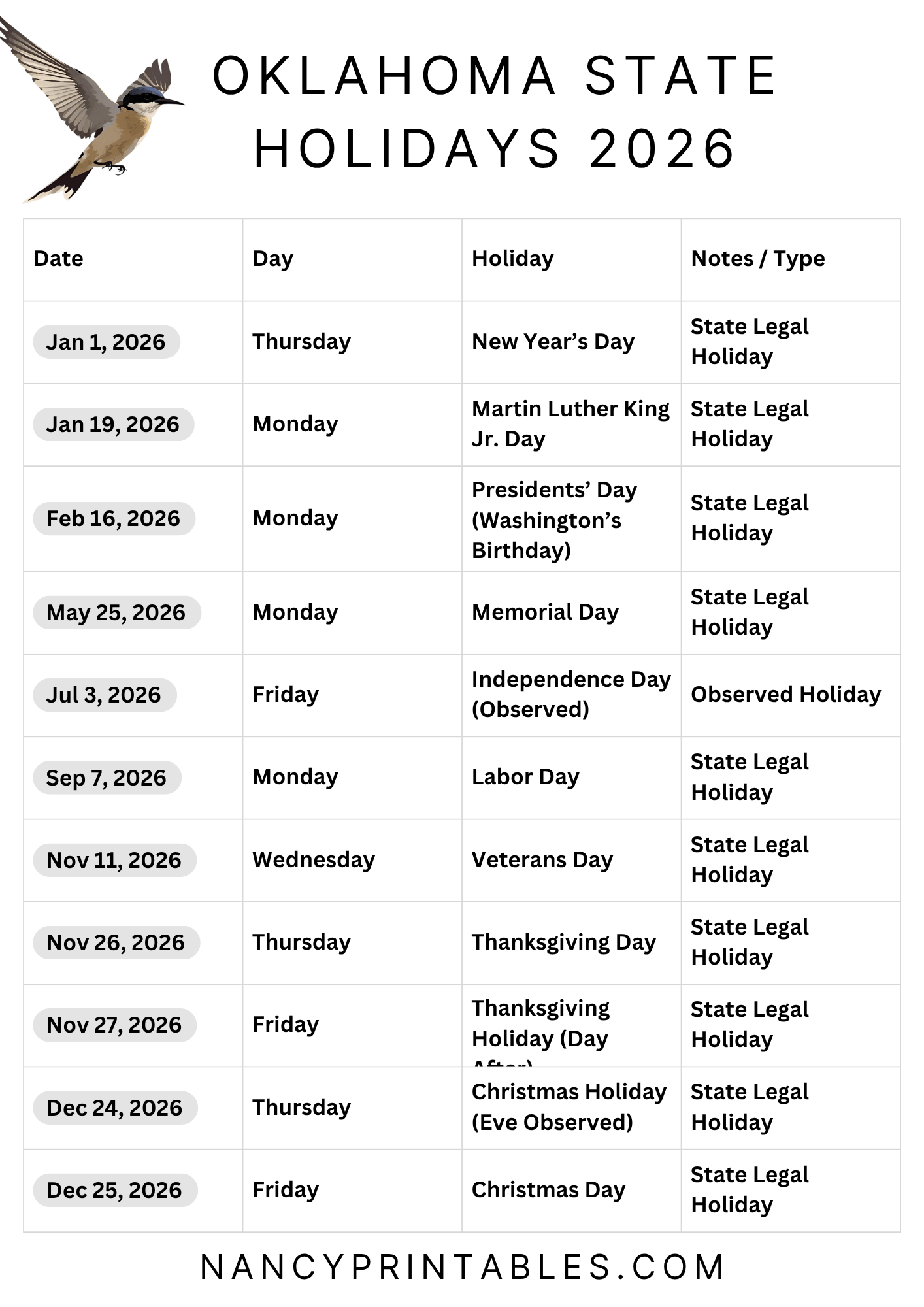 Oklahoma State Holidays 2026 pdf printable