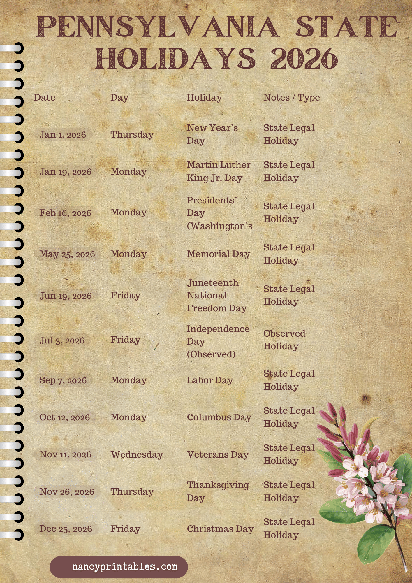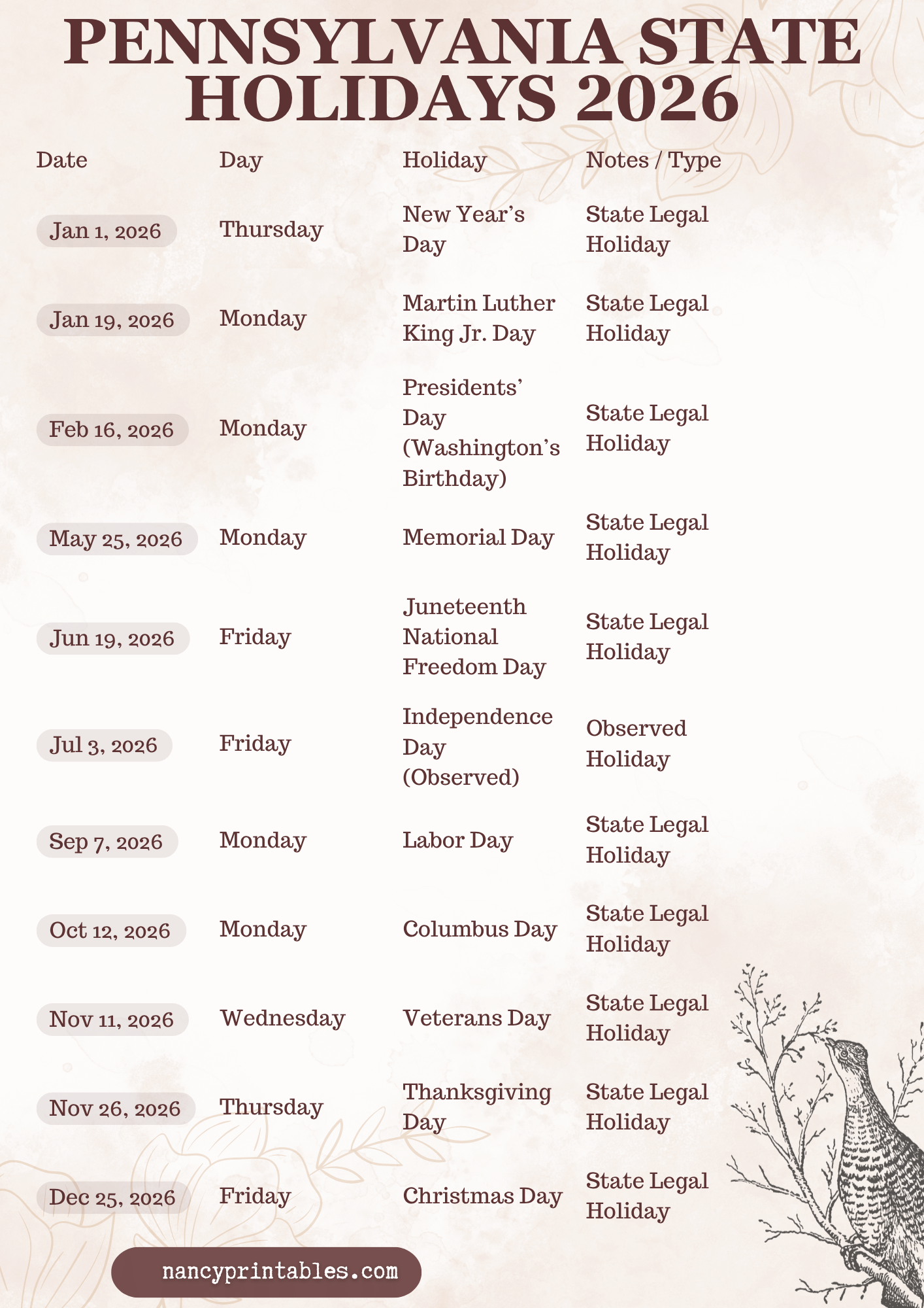 Pennsylvania State Holidays 2026 PDF Printable