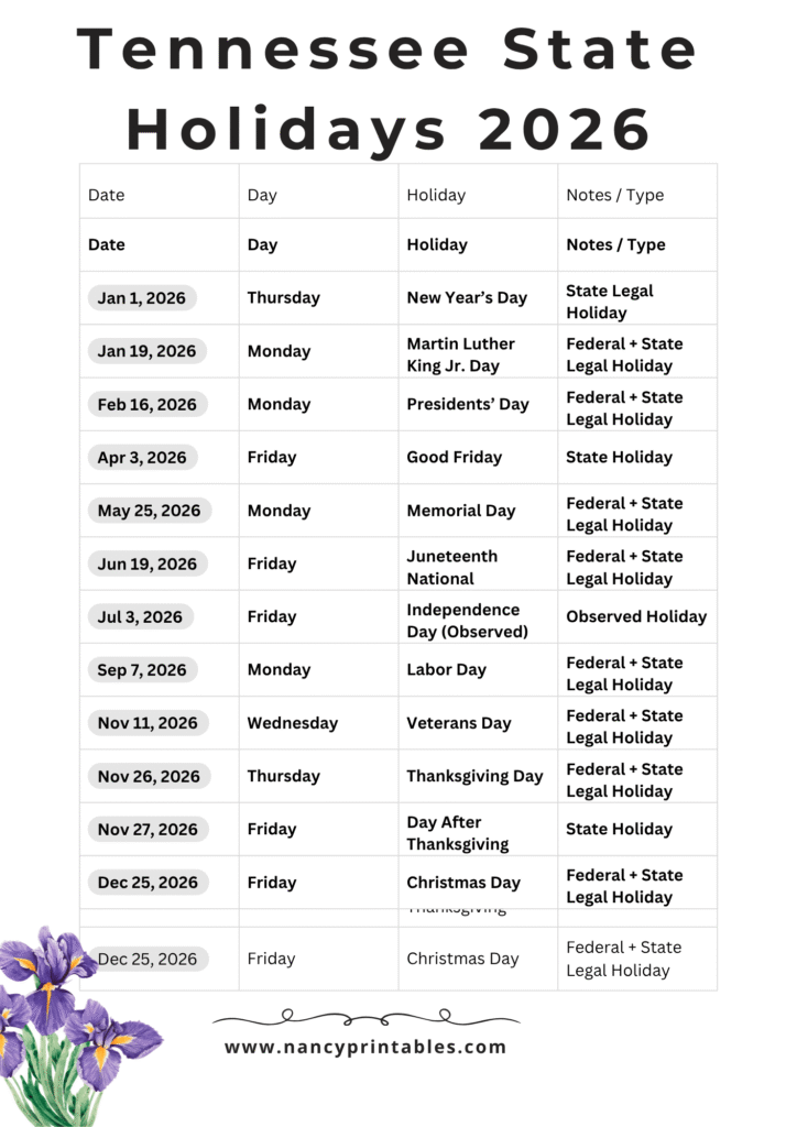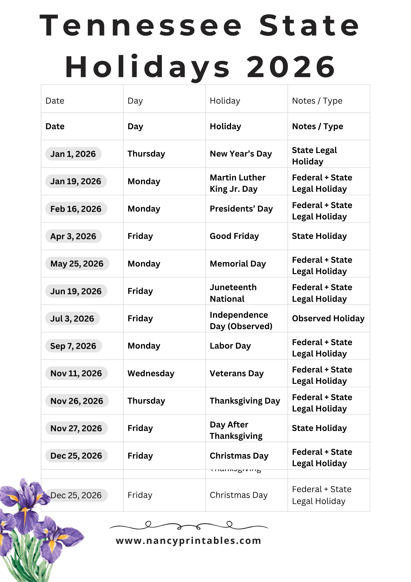 Tennessee observes all major federal holidays in 2026 while also including state-specific observances such as Good Friday and the Day After Thanksgiving. These holidays guide official closures for state offices, courts, and public agencies across Tennessee.