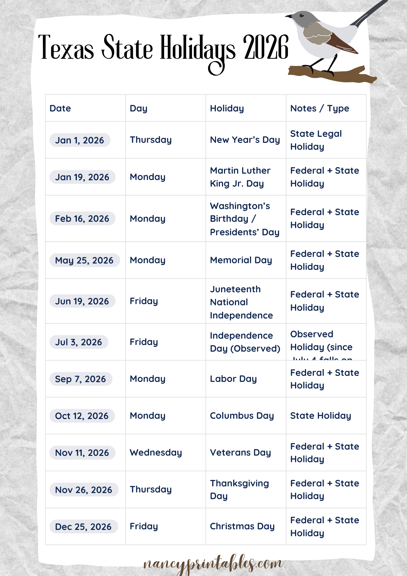 Texas State Holidays 2026 PDF Printable