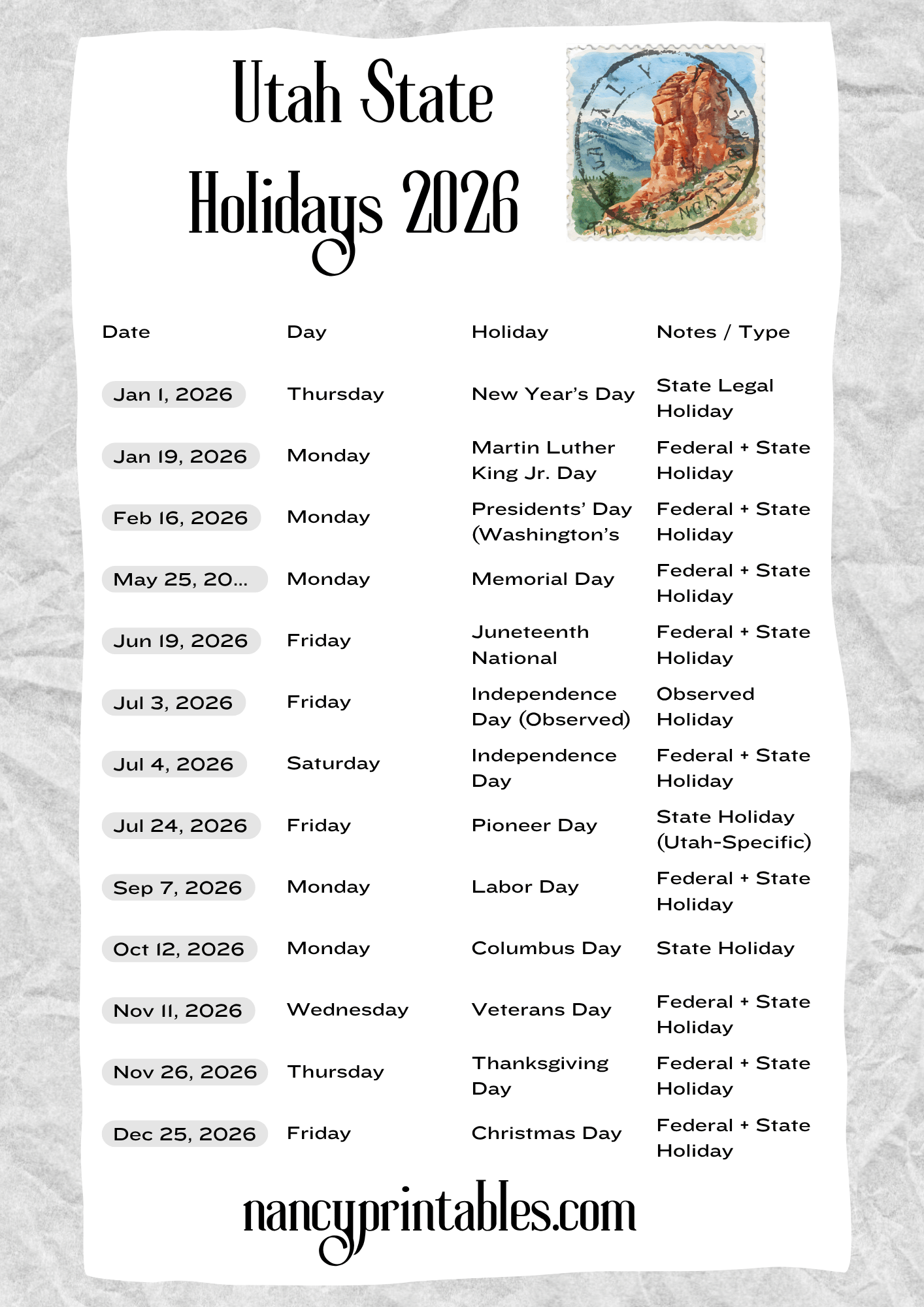 Utah observes all major federal holidays in 2026 and also celebrates the uniquely significant Pioneer Day on July 24. These dates determine official closures for state agencies, courts, and many public institutions.