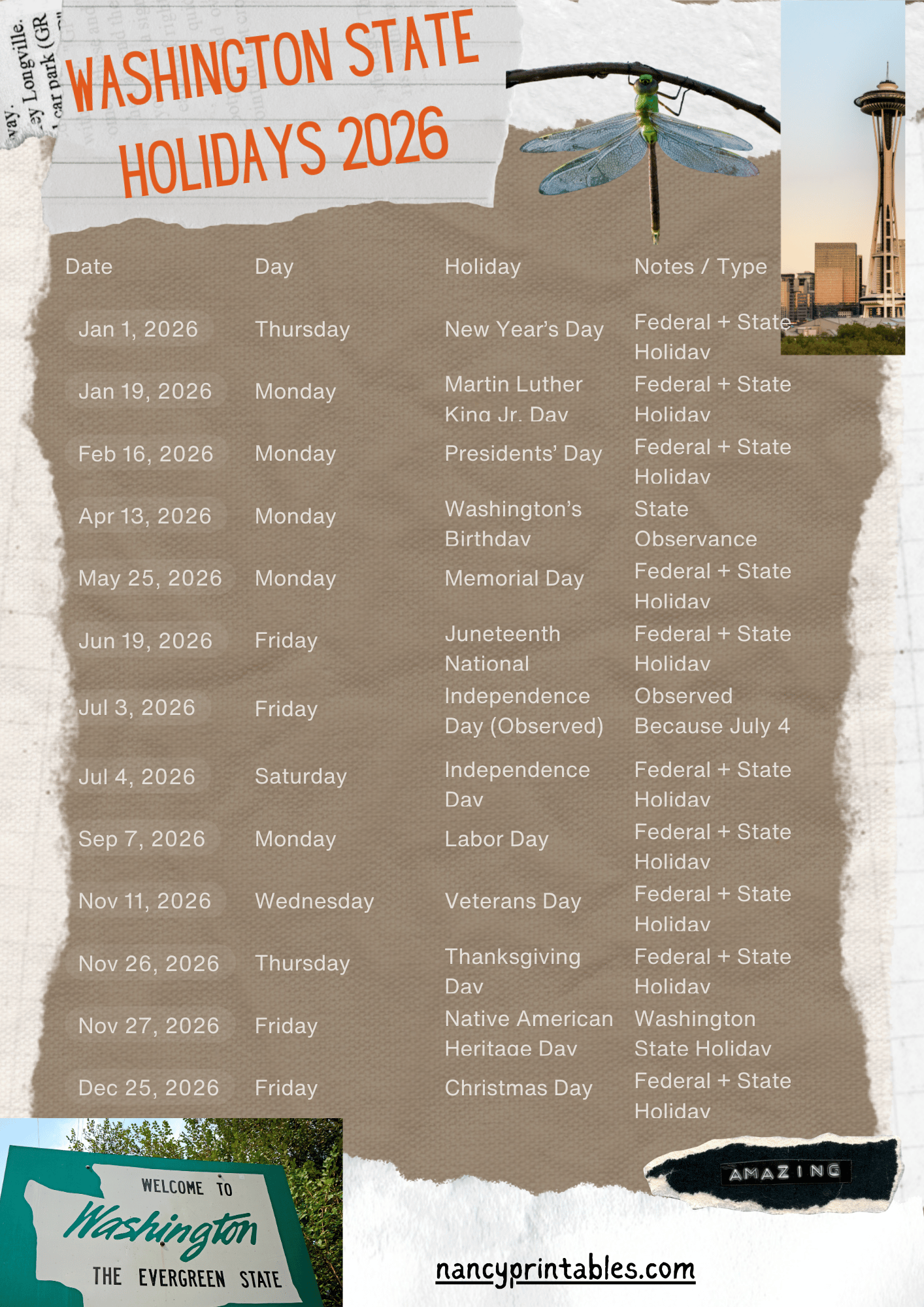 Official Washington State Holidays for 2026