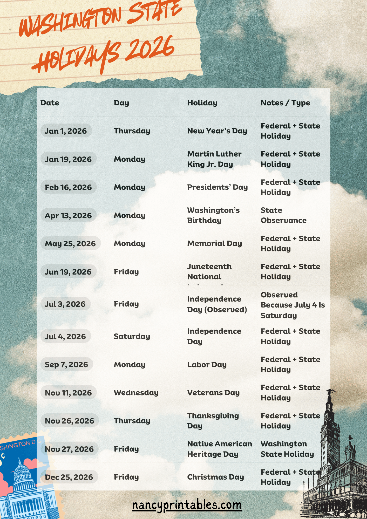Washington State Holidays 2026 – WA Printable Calendar